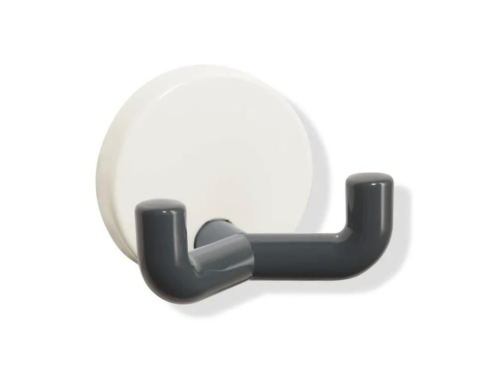 Vis mere Dobbelt krog med fastgørelsesroset, diameter roset 50 mm, 44 mm dyb, fremstillet af polyamid af høj kvalitet, Rosethætte i HEWI-farve 99 (ren hvid). Krogdel i henhold til HEWI's farvekort, inklusive korrosionsfrit HEWI-fastgørelsesmateriale.