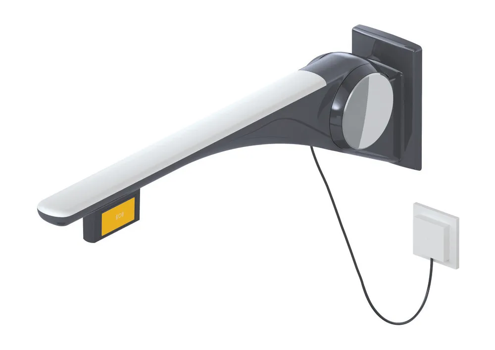 Vis mere Udkragning i aluminium, pulverlakeret, blank med grebspude af plast, med højglansforkromede designelementer, plastoverflade af høj kvalitet og ridsefast pulverlakering, fremspring 750 mm, med funktionsknap (E-version), højre udgave, Enkel installation takket være separat installation af monteringspladen i rustfrit stål, mat poleret, testet op til 150 kg ved brug af HEWI-fastgørelsesmateriale, Anbefalet maksimal vægt for brugeren: 150 kg, er produceret i overensstemmelse med CE- og UKCA-forordning (EU) 2017/745 om medicinsk udstyr, opfylder de krav, der gælder i Belgien (CWATUPE, WVG Vlaanderen) med hensyn til fremspringet af det sammenklappelige støttehåndtag på toilettet.