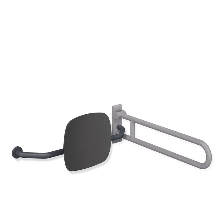 Vis mere Polyamid, højglans, Plastryglæn i HEWI-farve 92 (antracitgrå), Bredde 650 til 750 mm, Dybde 230 mm, Ryglæn 334 mm højt og 370 mm bredt, Stangdiameter 33 mm, ensidig montering på væggen med rosetter (højre), ensidig montering på foldbare støttehåndtag eller vægstøttehåndtag med vægplade (venstre).