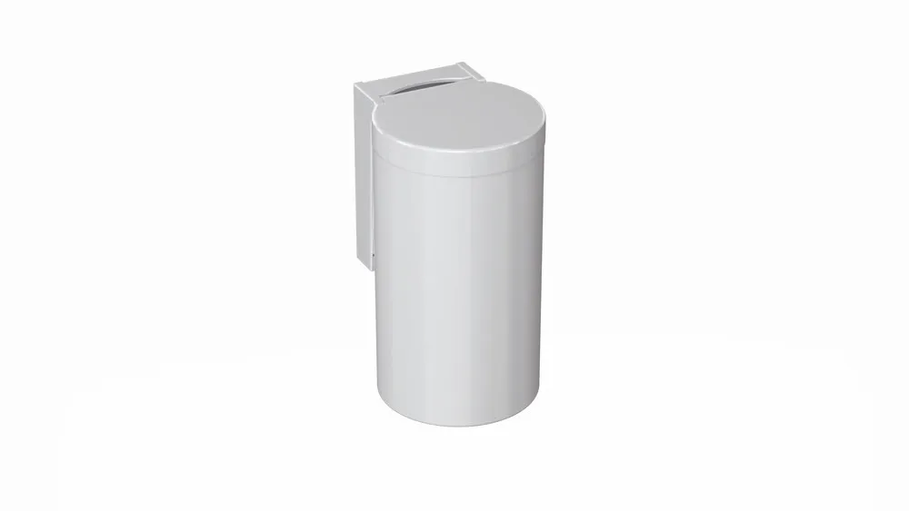zylindrisch geformter Behälter mit Klappdeckel, der Abfallbehälter ist abnehmbar, Inhalt ca. 6 Liter, 330 mm hoch, 210 mm tief und 180 mm im Durchmesser, mit Haftetikett zur Erläuterung der Bedienung per Knie, Aufsatz aus hochwertigem Polyamid nach HEWI Farbtabelle, inklusive korrosionsfreiem HEWI Befestigungsmaterial.