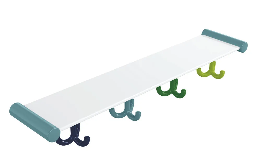 Halter aus hochwertigem Polyamid in HEWI Farbe 74 (Apfelgrün), 99 (Reinweiß) oder 55 (Aquablau), Dreifachhaken aus hochwertigem Polyamid nach HEWI Farbtabelle, Trägerplatte aus robustem HPL, Oberfläche: weiß, seidig glänzend, mit leichter Struktur, Abstand zwischen den Plätzen von 150 mm, entspricht den Vorgaben der DGUV-Richtlinie 82 "Kindertageseinrichtungen", max. statische Belastung 20 kg, 630 mm breit (Achsmaß 600 mm), 89 mm hoch, 132 mm tief.