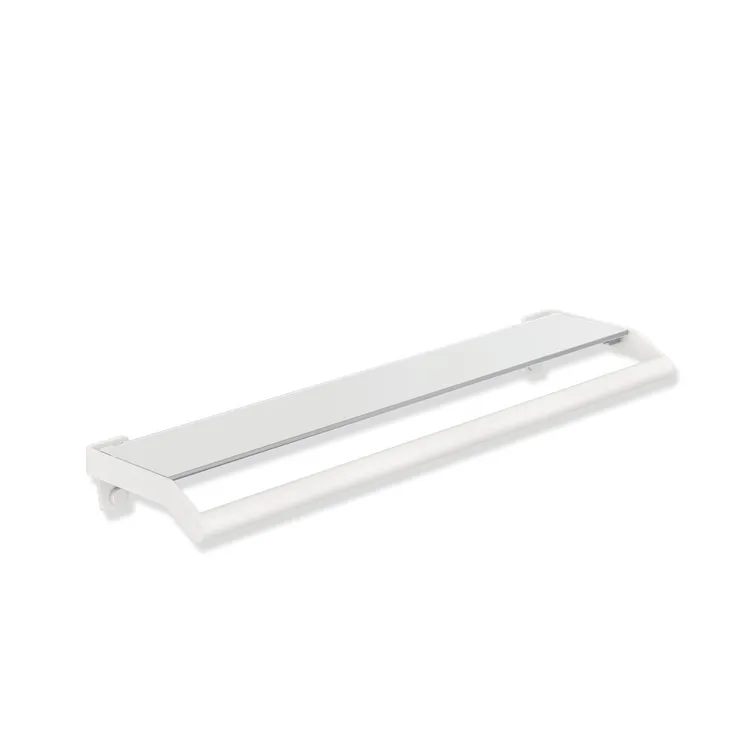Mehr anzeigen Ablage mit integriertem Haltegriff vorn, durchgehende Spiegellösung möglich, Halter aus hochwertigem Edelstahl, pulverbeschichtet in den HEWI Farben DX (Weiß tiefmatt), DC (Schwarz tiefmatt) und SC (Dunkelgrau Perlglimmer tiefmatt), Glasplatte mit Splitterschutzfolie, Weiß hinterlackiert, 720 mm breit, 70 mm hoch, 188 mm tief, Durchmesser Haltegriff 25 mm, inklusive korrosionsfreiem HEWI Befestigungsmaterial.