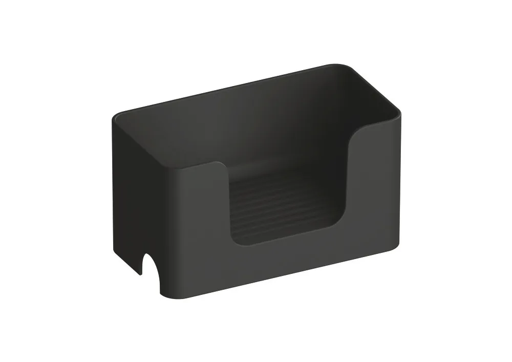 rechteckig geformter Behälter mit hohen Seitenwänden und Wasserablauf, Aussparung an der Vorderseite, diebstahlhemmend, rutschhemmende Ablagefläche, zum Aufstecken auf Stangensystem Durchmesser 33 mm, dient zum Aufbewahren von Accessoires, 200 mm breit, 110 mm hoch und 107 mm tief, aus hochwertigem mattem Polyamid in den HEWI Farben 99 (Reinweiß), 98 (Signalweiß), 97 (Lichtgrau), 95 (Felsgrau) und 92 (Anthrazitgrau).