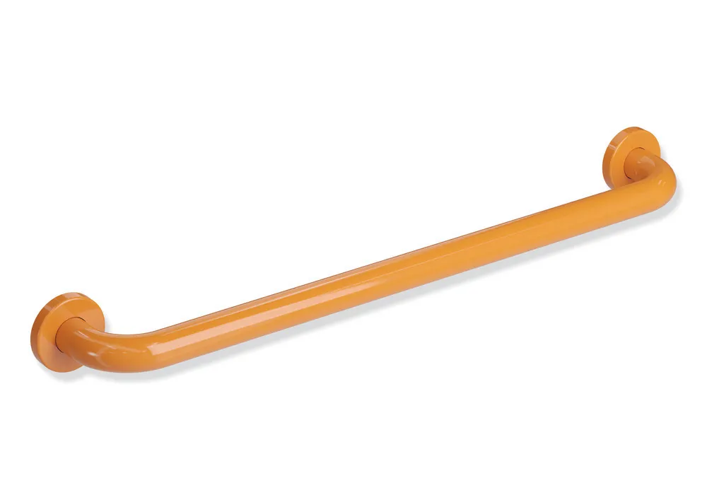 an den Enden im rechten Winkel abgebogene Stange mit Befestigungsrosetten, Befestigung mit Rosetten, 570 mm breit (Achsmaß), 85 mm tief und 28 mm im Durchmesser, Rosettendurchmesser 60 mm, aus hochwertigem Polyamid nach HEWI Farbtabelle, inklusive korrosionsfreiem HEWI Befestigungsmaterial.