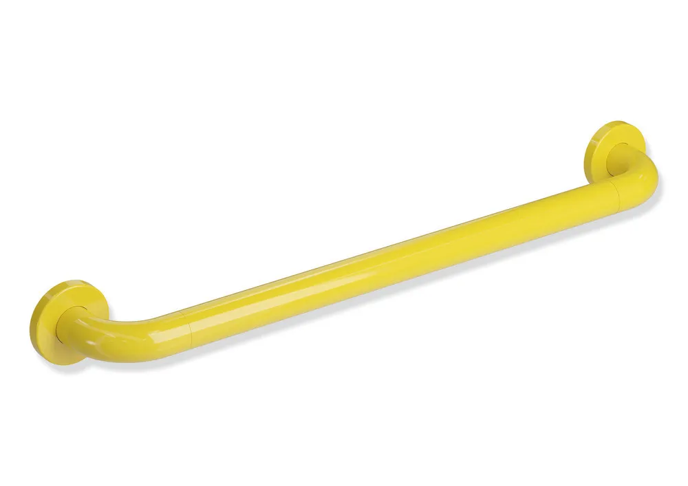 an den Enden im rechten Winkel abgebogene Stange mit Befestigungsrosetten, mit korrosionsgeschützter Stahleinlage, 600 mm breit (Achsmaß), 90 mm tief und 33 mm im Durchmesser, Rosettendurchmesser 70 mm, aus hochwertigem Polyamid nach HEWI Farbtabelle, inklusive korrosionsfreiem HEWI Befestigungsmaterial.