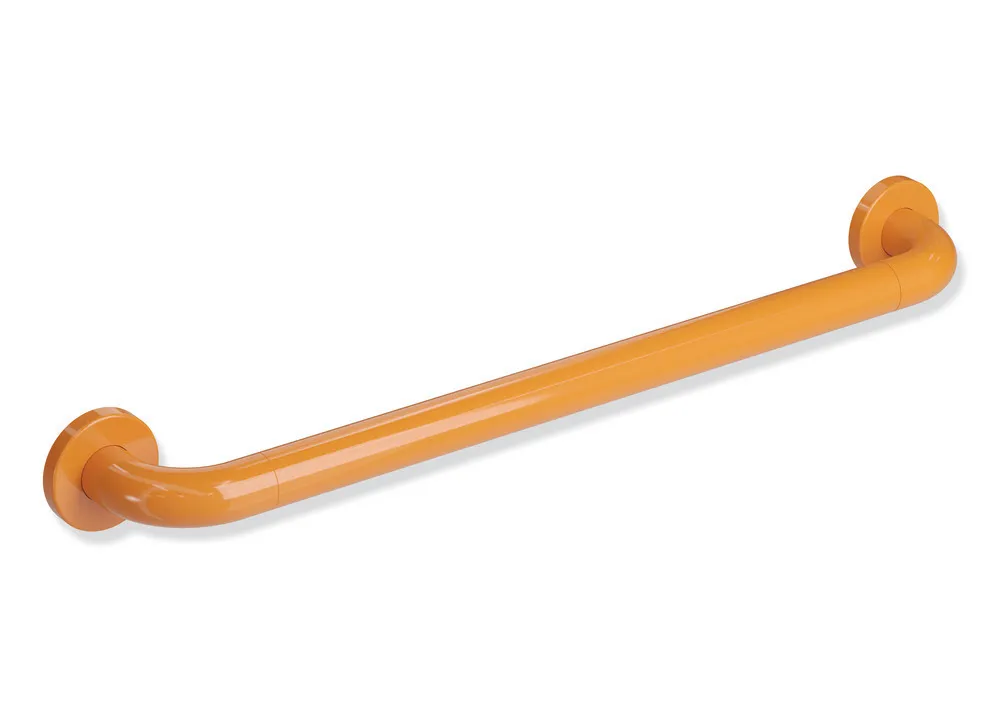 an den Enden im rechten Winkel abgebogene Stange mit Befestigungsrosetten, mit korrosionsgeschützter Stahleinlage, 600 mm breit (Achsmaß), 90 mm tief und 33 mm im Durchmesser, Rosettendurchmesser 70 mm, aus hochwertigem Polyamid nach HEWI Farbtabelle, inklusive korrosionsfreiem HEWI Befestigungsmaterial.