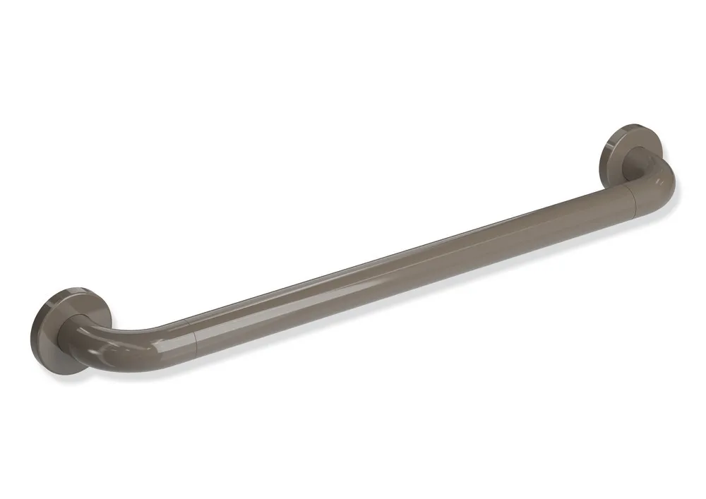 an den Enden im rechten Winkel abgebogene Stange mit Befestigungsrosetten, mit korrosionsgeschützter Stahleinlage, 600 mm breit (Achsmaß), 90 mm tief und 33 mm im Durchmesser, Rosettendurchmesser 70 mm, aus hochwertigem Polyamid nach HEWI Farbtabelle, inklusive korrosionsfreiem HEWI Befestigungsmaterial.