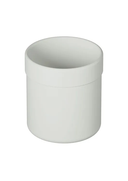 runder Becher mit flachem Boden, freistehend und geeignet als Einsatz für den kleinen Halter, 80 mm hoch und 73 mm im Durchmesser, aus hochwertigem, mattem Polyamid in den HEWI Farben 99 (Reinweiß), 98 (Signalweiß), 97 (Lichtgrau), 95 (Felsgrau), 92 (Anthrazitgrau), 55 (Aquablau) und 36 (Koralle)