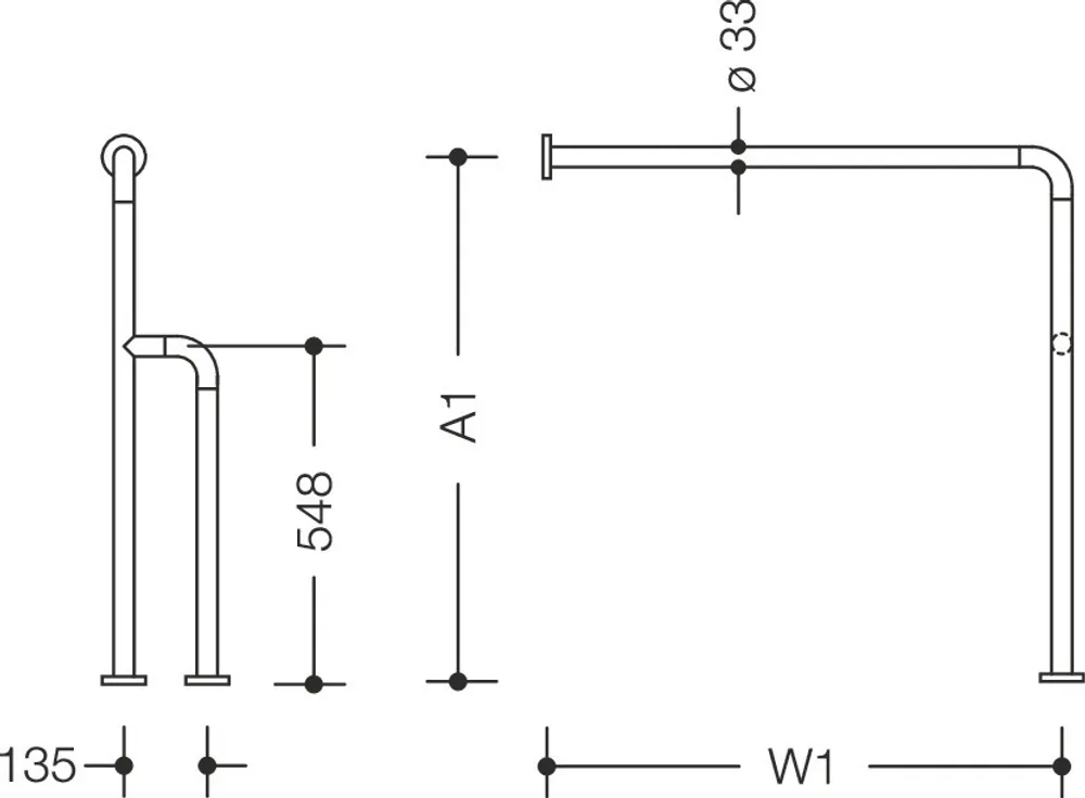 senkrecht und waagerecht angeordnete, im rechten Winkel verbundene Stangen mit Stahl-Befestigungsrosetten, auf Maß gefertigt 300 mm bis 834 mm breit, 670 mm bis 950 mm hoch und 135 mm tief, Stangendurchmesser 33 mm, Rosettendurchmesser 70 mm, mit durchgehendem, korrosionsgeschütztem Stahlkern, aus hochwertigem Polyamid nach HEWI Farbtabelle, inkl. korrosionsfreiem HEWI Befestigungsmaterial.