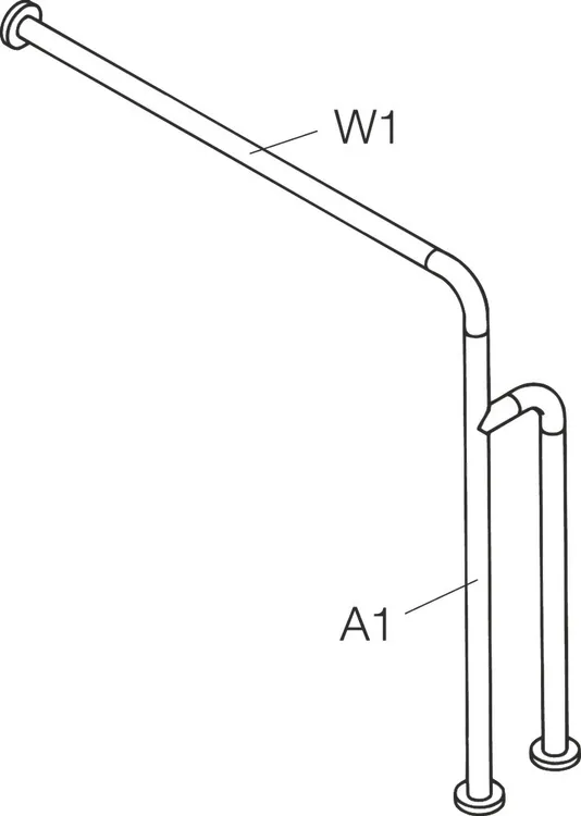 Mehr anzeigen senkrecht und waagerecht angeordnete, im rechten Winkel verbundene Stangen mit Stahl-Befestigungsrosetten, auf Maß gefertigt 300 mm bis 834 mm breit, 670 mm bis 950 mm hoch und 135 mm tief, Stangendurchmesser 33 mm, Rosettendurchmesser 70 mm, mit durchgehendem, korrosionsgeschütztem Stahlkern, aus hochwertigem Polyamid nach HEWI Farbtabelle, inkl. korrosionsfreiem HEWI Befestigungsmaterial.