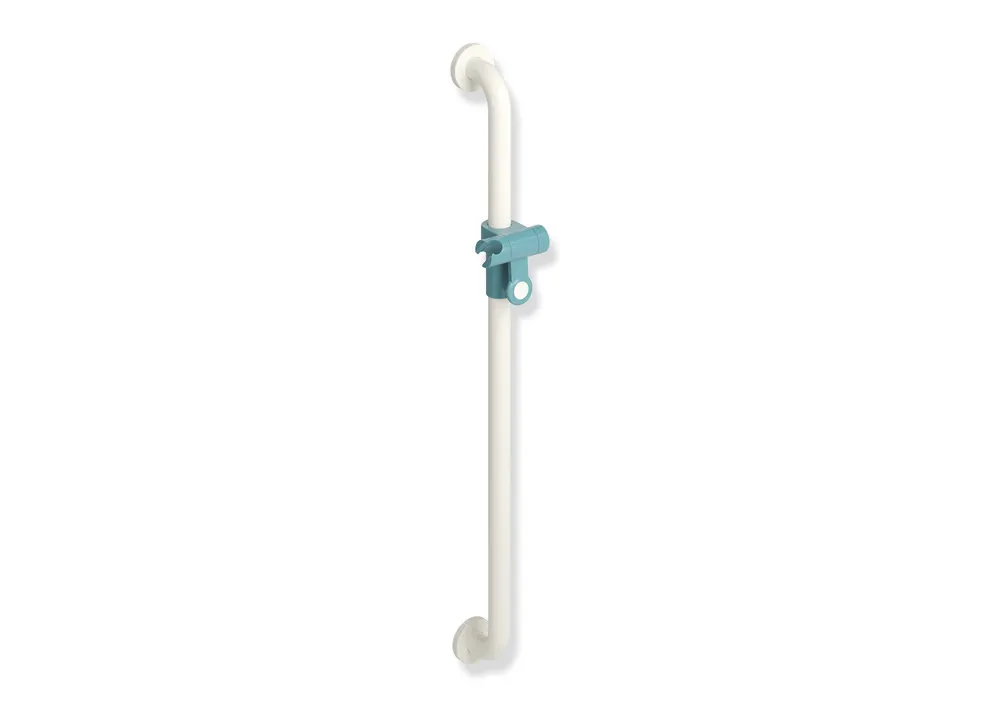 Polyamid, hochglänzend, zweifarbige Brausehalterstange, Stange und Rosetten: 99 (Reinweiß), Brausehalter: 55 (Aquablau), Achsmaß 900 mm, Durchmesser 33 mm, mit stufenlos verstellbarem Brausehalter.