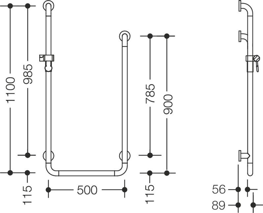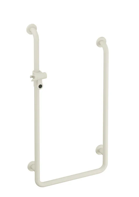 senkrecht und waagerecht in U-Form angeordnete, im rechten Winkel verbundene Stangen mit Stahl-Befestigungsrosetten und Brausehalter, senkrechte Längen A1 = 1100 mm, A2 = 900 mm, waagerechte Länge 500 mm, 89 mm tief, Stangendurchmesser 33 mm, Rosettendurchmesser 70 mm, links- und rechtsseitig montierbar, aus hochwertigem, mattem Polyamid in den HEWI Farben 99 (Reinweiß), 98 (Signalweiß), 97 (Lichtgrau), 95 (Felsgrau) und 92 (Anthrazitgrau), Funktionsbereich des Brausehalters in hochwertigem, glänzendem Polyamid, inkl. korrosionsfreiem HEWI Befestigungsmaterial.