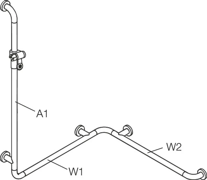 Mehr anzeigen senkrecht und waagerecht angeordnete, im rechten Winkel verbundene Stangen mit Stahl-Befestigungsrosetten und Brausehalter, senkrechte Länge auf Maß gefertigt von 600 mm bis 1250 mm, waagerechte Längen auf Maß gefertigt von 475 mm bis 1800 mm, 89 mm tief, Stangendurchmesser 33 mm, Rosettendurchmesser 70 mm, links- und rechtsseitig montierbar, aus hochwertigem, mattem Polyamid in den HEWI Farben 99 (Reinweiß), 98 (Signalweiß), 97 (Lichtgrau), 95 (Felsgrau) und 92 (Anthrazitgrau), Funktionsbereich des Brausehalters in hochwertigem, glänzendem Polyamid, inkl. korrosionsfreiem HEWI Befestigungsmaterial.