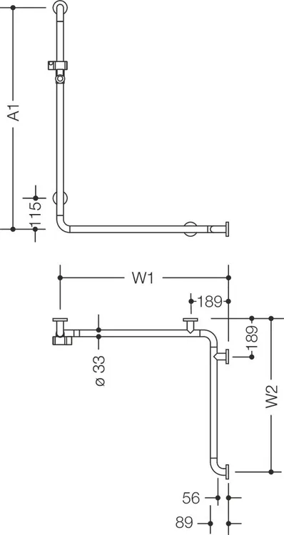 senkrecht und waagerecht angeordnete, im rechten Winkel verbundene Stangen mit Stahl-Befestigungsrosetten und Brausehalter, senkrechte Länge auf Maß gefertigt von 600 mm bis 1250 mm, waagerechte Längen auf Maß gefertigt von 475 mm bis 1800 mm, 89 mm tief, Stangendurchmesser 33 mm, Rosettendurchmesser 70 mm, links- und rechtsseitig montierbar, aus hochwertigem, mattem Polyamid in den HEWI Farben 99 (Reinweiß), 98 (Signalweiß), 97 (Lichtgrau), 95 (Felsgrau) und 92 (Anthrazitgrau), Funktionsbereich des Brausehalters in hochwertigem, glänzendem Polyamid, inkl. korrosionsfreiem HEWI Befestigungsmaterial.