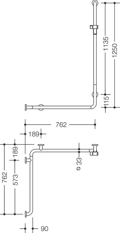 Edelstahl, matt geschliffen, mit stufenlos verstellbarem Brausehalter aus hochglänzendem Polyamid in den HEWI Farben 90 (Tiefschwarz), 92 (Anthrazitgrau), 98 (Signalweiß) oder 99 (Reinweiß), senkrechte Länge 1250 mm, waagerechte Längen 762 mm, Durchmesser 33 mm, Ausführung links, getestet bis 200 kg bei Verwendung mit HEWI Befestigungsmaterial, empfohlenes maximales Gewicht des Anwenders: 150 kg.