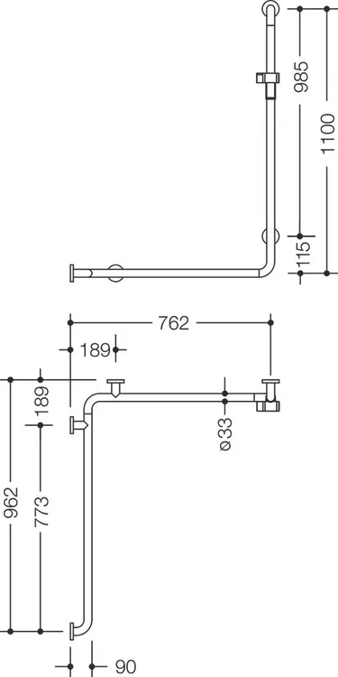 Edelstahl, matt geschliffen, mit stufenlos verstellbarem Brausehalter aus hochglänzendem Polyamid in den HEWI Farben 90 (Tiefschwarz), 92 (Anthrazitgrau), 98 (Signalweiß) oder 99 (Reinweiß), senkrechte Länge 1100 mm, waagerechte Längen 762 und 962 mm, Durchmesser 33 mm, Ausführung links, getestet bis 200 kg bei Verwendung mit HEWI Befestigungsmaterial, empfohlenes maximales Gewicht des Anwenders: 150 kg, erfüllt die Anforderungen nach ÖNORM B1600/1601.