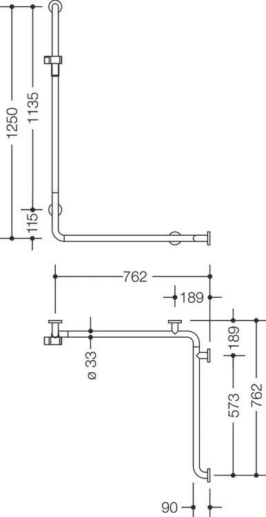 Edelstahl, matt geschliffen, mit stufenlos verstellbarem Brausehalter aus hochglänzendem Polyamid in den HEWI Farben 90 (Tiefschwarz), 92 (Anthrazitgrau), 98 (Signalweiß) oder 99 (Reinweiß), senkrechte Länge 1250 mm, waagerechte Längen 762 mm, Durchmesser 33 mm, Ausführung rechts, getestet bis 200 kg bei Verwendung mit HEWI Befestigungsmaterial, empfohlenes maximales Gewicht des Anwenders: 150 kg.
