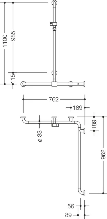 - senkrechte Länge 1100 mm, waagerechte Längen 762 mm und 962 mm (Eckmontage)