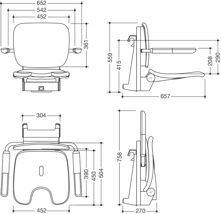Einhängung aus Edelstahl, pulverbeschichtet in den HEWI Farben Signalweiß, glänzend mit Sitz-/Rückenfläche und Armlehnen aus hochwertigem PUR/Integral-Hartschaum in SD (Signalweiß, matt) oder Einhängung in Anthrazit, glänzend mit Sitz-/Rückenfläche und Armlehnen in DR (Anthrazit, matt) mit hochglänzend verchromten Designelementen, hochwertige Kunststoffoberfläche und kratzfeste Pulverbeschichtung, Sitzfläche 452 mm breit, 450 mm tief, mit Rückenlehne und getrennt klappbaren Armlehnen, Sitzfläche mit Schamausschnitt und Wasserablauf, Sitzhöhe in vier Stufen von 420 mm bis 510 mm verstellbar (je 30 mm), getestet bis 200 kg, empfohlenes maximales Gewicht des Anwenders: 150 kg, wird gemäß CE- und UKCA-Verordnung (EU) 2017/745 über Medizinprodukte produziert, erfüllt die Anforderungen nach SIA 500.