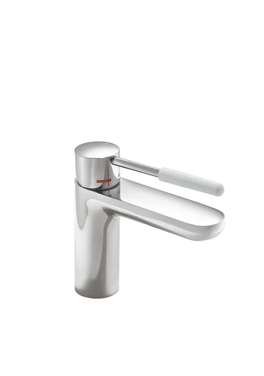 hochwertig verchromt, rund, mit farbigem Griffelement aus Polyamid in ausgewählten HEWI Farben, Durchfluss 5 l/min, Armaturenkörper Messing, offener Bedienhebel mit Warm-Kalt-Kennzeichnung, 141 mm hoch, Ausladung: 159 mm, Auslauf starr, ohne Ablaufgarnitur, Geräuschklasse 1.