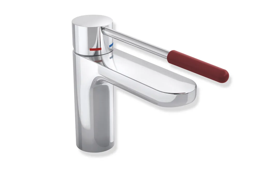 Mehr anzeigen hochwertig verchromt, rund, mit langem, farbigem Griffelement aus mattem Polyamid in ausgewählten HEWI Farben, geeignet für thermische Desinfektion nach DVGW W 551, Geräuschklasse 1, DVGW zertifiziert.
