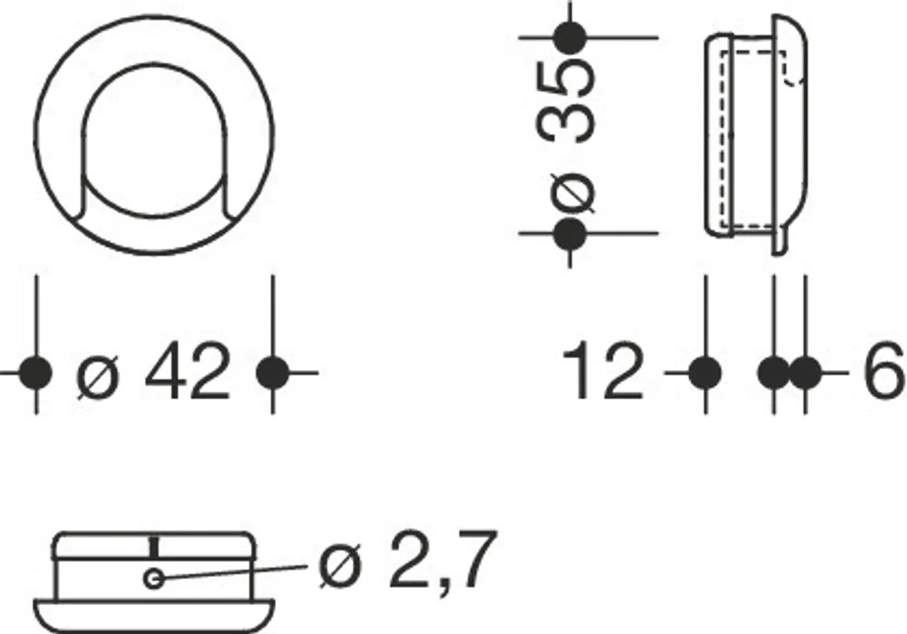 Mehr anzeigen aus durchgefärbtem, mattem Polyamid, Durchmesser 42 mm, 18 mm hoch, Einlasstiefe 12 mm, mit Griffmulde von unten offen.