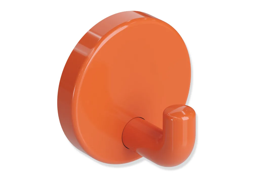rechtwinklig gebogener, zylindrischer Haken mit Befestigungsrosette, diebstahlgeschützt durch verdeckte Verschraubung, 30 mm tief, Rosettendurchmesser 40 mm, aus hochwertigem Polyamid nach HEWI Farbtabelle, Lieferung ohne Schrauben und Dübel.