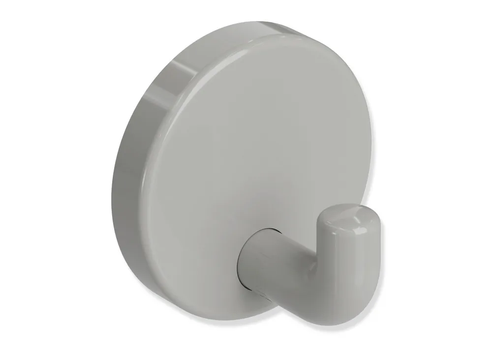 rechtwinklig gebogener, zylindrischer Haken mit Befestigungsrosette, diebstahlgeschützt durch verdeckte Verschraubung, 30 mm tief, Rosettendurchmesser 40 mm, aus hochwertigem Polyamid nach HEWI Farbtabelle, Lieferung ohne Schrauben und Dübel.