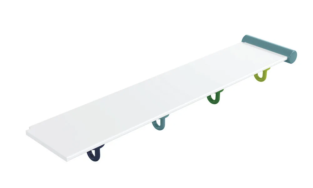 zum Nachrüsten der Ablage mit Handtuchhaken um 4 Plätze, Halter aus hochwertigem Polyamid in HEWI Farbe 74 (Apfelgrün), 99 (Reinweiß) oder 55 (Aquablau), Handtuchhaken aus hochwertigem Polyamid nach HEWI Farbtabelle, Trägerplatte aus robustem HPL, Oberfläche: weiß, seidig glänzend, mit leichter Struktur, entspricht den Vorgaben der DGUV-Richtlinie 82 "Kindertageseinrichtungen", Abstand zwischen den Plätzen von 150 mm, max. statische Belastung 20 kg, 608 mm breit, 59 mm hoch, 132 mm tief.