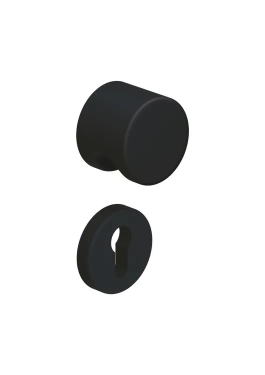 Mehr anzeigen in R-Technik nach DIN 18255 und DIN EN 1906 aus mattem Polyamid, bestehend aus: Knopf 122.23PB und Türdrücker 111.23PBR, Durchmesser 23 mm und Rundrosetten 305.23PBR und 306.23PBFS.