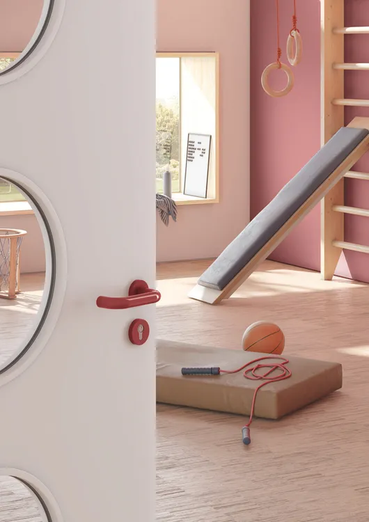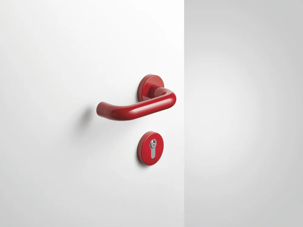 Türdrücker Modell 111.23R in U-Form aus Polyamid mit durchgehendem Stahlkern bis in das Drückerende, durchgängig eingefärbt, Durchmesser 23 mm, mit Ansatzführung und Rastnut, Montage durch einfaches Einrasten der Türdrücker in die auf der Tür vormontierten Unterteile.