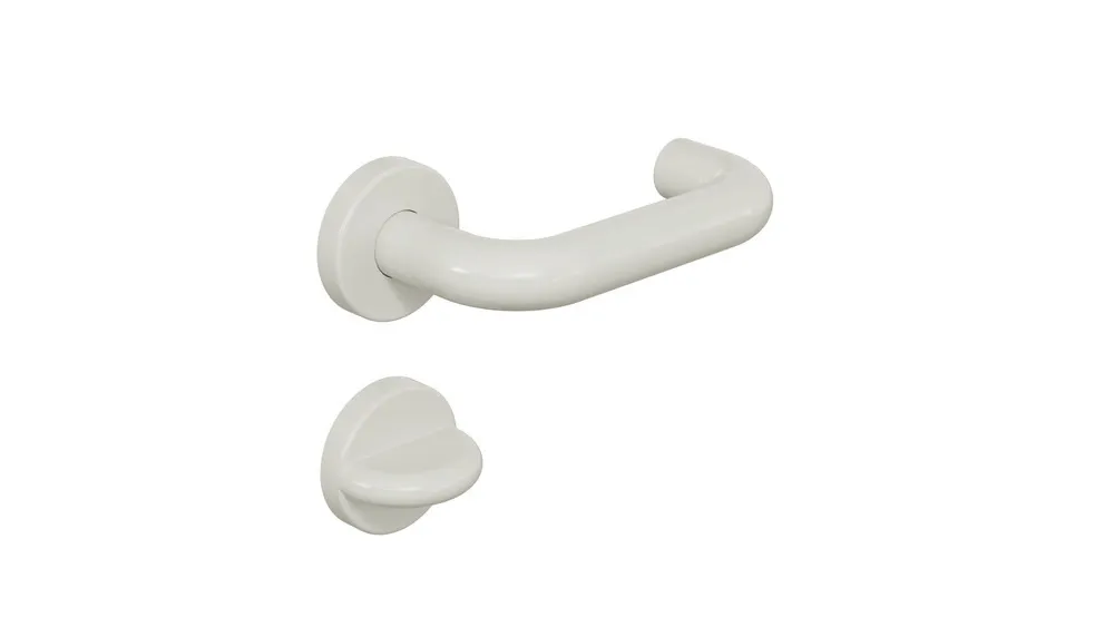 in R-Technik nach DIN 18255 und DIN EN 1906 aus Polyamid, Oberfläche hochglänzend, bestehend aus: Türdrücker 111.23R, Durchmesser 23 mm und Rundrosetten 305.23R und 306.23NR, WC-Ausführung mit Notöffnung mittels Vierkantdorn oder Münze und Schauscheibe (Anzeige rot/weiß) auf der Außenseite.