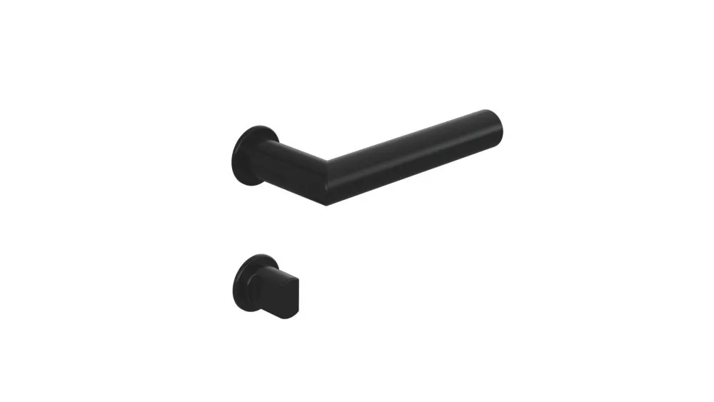 mit flacher Drückerrosette, Abdeck-Kappe aus mattem Polyamid, Türdrücker Modell 162.21PBM in Gehrungsform aus mattem Polyamid mit durchgehendem Stahlkern, Vierkantstift 8 mm, für Österreich 8,5 mm, mit Trapezgewinde. Fixierung der Drücker in einem Einpresslager und einer Polyamid-Gleitlagerbuchse. Mit WC-Rosette 306PBMNR, Durchmesser 32 mm, Ausführung mit Notöffnung Münze, optional Schauscheibe (rot/grün) auf Außenseite. Montage der Einpressbuchsen mittels Montagemutter mit Trapezgewinde, SW 19, mit einem Ringschlüssel SW 19. Die Montage wird empfohlen an stumpfen wie auch gefälzten Wohnraum- und Innentüren mit HDF-Deckplatte und Mittellagen aus Röhrenspan- bzw. Vollspaneinlage oder hochwertiger.
