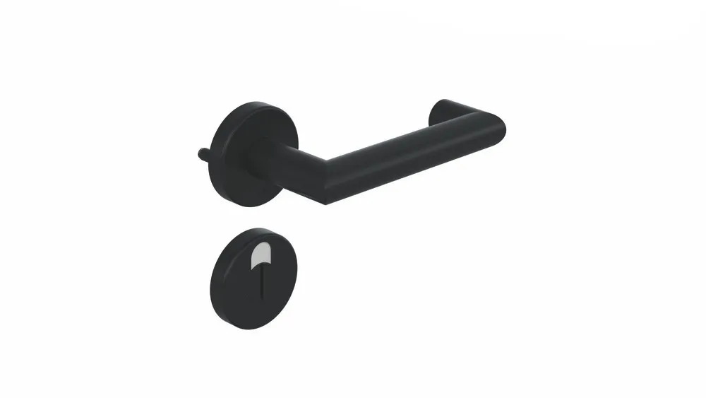 Mehr anzeigen in R-Technik nach DIN 18255 und DIN EN 1906 aus mattem Polyamid, bestehend aus: Türdrücker 165.21PBR, Durchmesser 21,3 mm und Rundrosetten 305.21PBR und 306.23PBNR, WC-Ausführung mit Notöffnung mittels Vierkantdorn oder Münze und Schauscheibe (Anzeige rot/weiß) auf der Außenseite.