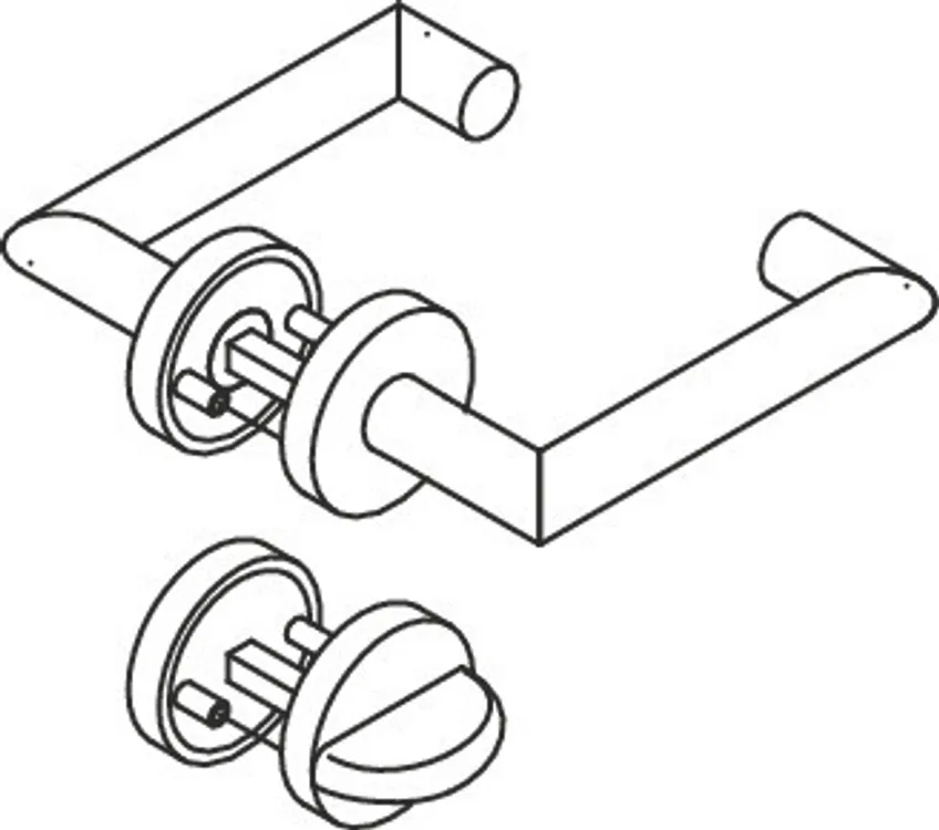 Rosetten: Modell 305.21PB... und 306.23PBNR, Rosettenunterkonstruktion in Kunststoff-Edelstahlverbundbau, DIN links und DIN rechts verwendbar. Festdrehbarlagerung der Drücker mit selbsttätig einrastender Rundumverriegelung und 5 mm Lagerstelle als wartungsfreies Gleitlager mit elastischem Ausgleichsbereich und zweiter Lagerstelle im Drückerhals. Verdeckte, lockerungssichere Verschraubung. WC-Ausführung mit Notöffnung mittels Vierkantdorn oder Münze und Schauscheibe (Anzeige rot/weiß) auf der Außenseite.