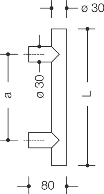 Gerader Griff mit eingerückter gerader Anbindung, Edelstahl, Oberfläche matt geschliffen, Grifflänge im Bereich von 300 mm bis 2299 mm, aus Rundrohr Durchmesser 30 mm, 1,5 mm Wandstärke, für einseitige und paarweise Befestigung.