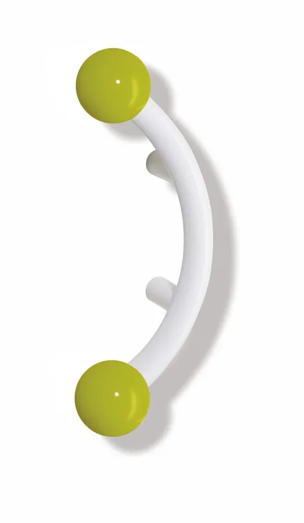 Mehr anzeigen Bogenförmiger Griff, Durchmesser 23 mm, mit gerader Anbindung und jeweils einer farbigen Kugel, zur Montage vorgerichtet für Trennwand-Türen, Achsmaß 97 mm, aus durchgefärbtem Polyamid, mit einseitiger Befestigung.