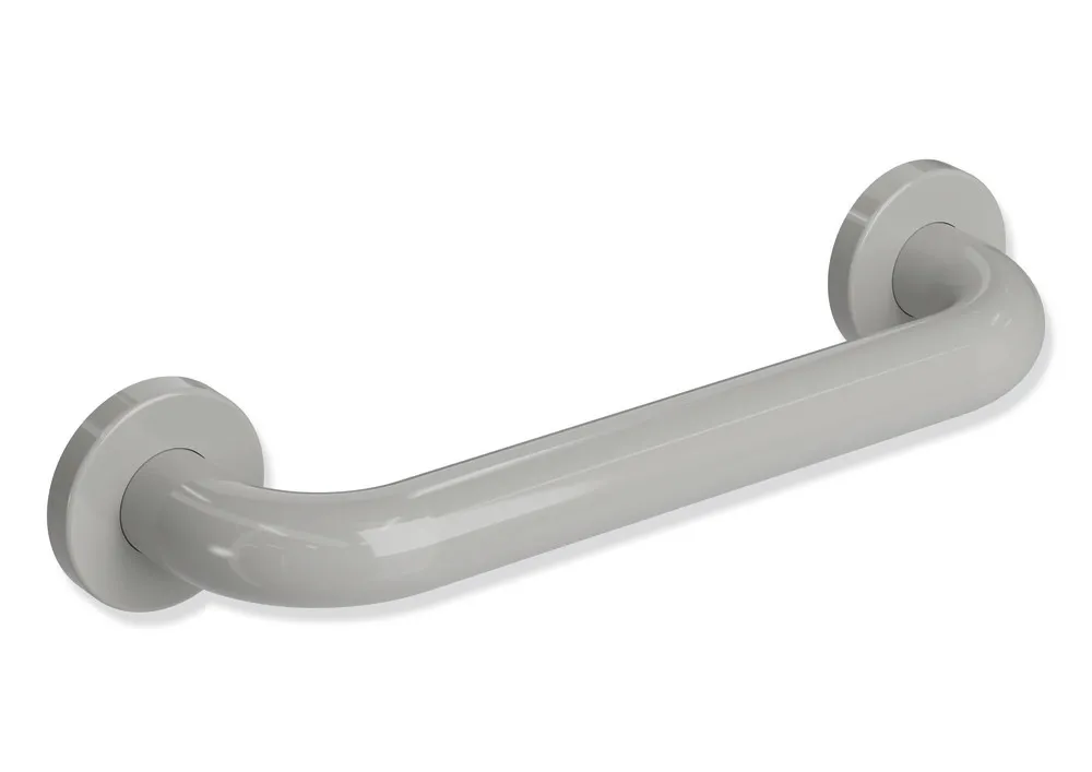 an den Enden im rechten Winkel abgebogene Stange mit Befestigungsrosetten, zur Montage an der Wand mit Rosetten, 300 mm breit (Achsmaß), 90 mm tief und 33 mm im Durchmesser, Rosettendurchmesser 70 mm, aus hochwertigem Polyamid nach HEWI Farbtabelle, inklusive korrosionsfreiem HEWI Befestigungsmaterial.