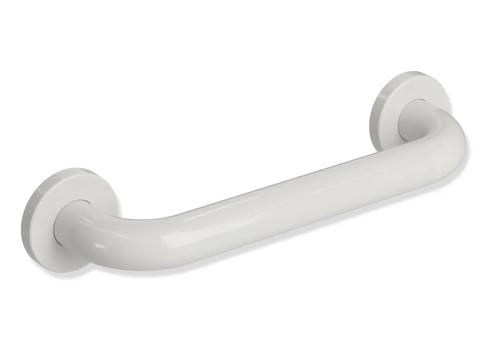 an den Enden im rechten Winkel abgebogene Stange mit Befestigungsrosetten, zur Montage an der Wand mit Rosetten, 300 mm breit (Achsmaß), 90 mm tief und 33 mm im Durchmesser, Rosettendurchmesser 70 mm, aus hochwertigem Polyamid nach HEWI Farbtabelle, inklusive korrosionsfreiem HEWI Befestigungsmaterial.