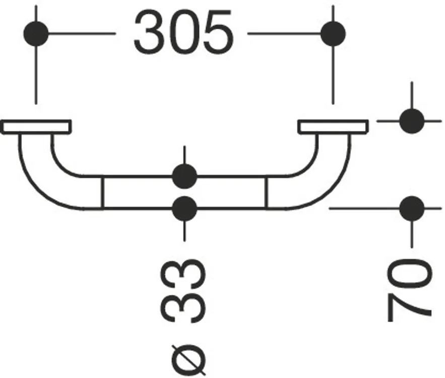 an den Enden im rechten Winkel abgebogene Stange mit Stahl-Befestigungsrosetten, mit durchgehendem, korrosionsgeschütztem Stahlkern, Achsmaß 12 inch (305 mm), 2 3/4 inch (70 mm) tief, Stangendurchmesser 1 5/16 inch (33 mm), Rosettendurchmesser 2 3/4 inch (70 mm), aus hochwertigem, mattem Polyamid in den HEWI Farben 99 (Reinweiß), 95 (Felsgrau) und 92 (Anthrazitgrau), erfüllt die Anforderungen nach 2010 ADA Standards und ICC/ANSI A117.1-2017, Aufrüstsatz WC-Papierhalter 801.50US010 nachrüstbar.