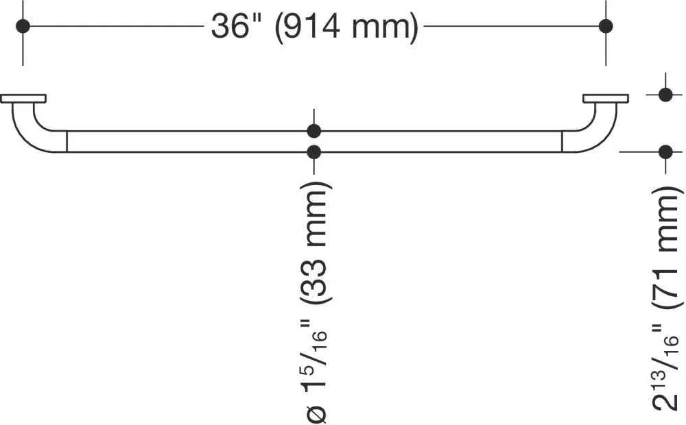 Polyamid, chromoptisch beschichtet, Achsmaß 36 inch (914 mm), Tiefe 2 3/4 inch (70 mm), Stangendurchmesser 1 5/16 inch (33 mm), maximale Belastbarkeit 250 lbs (114 kg), erfüllt die Anforderungen nach 2010 ADA Standards und ICC/ANSI A117.1-2017.