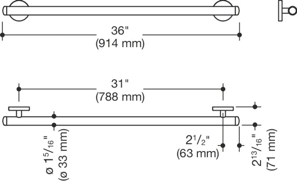 gerade Stange, mit durchgehendem, korrosionsgeschütztem Stahlkern, Außenmaß 36 inch (914 mm), Stangendurchmesser 1 5/16 inch (33 mm), 2 13/16 inch (71 mm) tief, Rosettendurchmesser 3 1/8 inch (80 mm), Kappenhöhe 1/2 inch (13 mm), inklusive korrosionsfreiem HEWI Befestigungsmaterial, maximale Belastbarkeit 250 lbs (113 kg), aus hochwertigem Polyamid in den HEWI Farben 99 (Reinweiß), 95 (Felsgrau), 92 (Anthrazitgrau), 90 (Tiefschwarz), 86 (Sand), 84 (Umbra) und 33 (Rubinrot), erfüllt die Anforderungen nach 2010 ADA Standards und ICC/ANSI A117.1-2017.