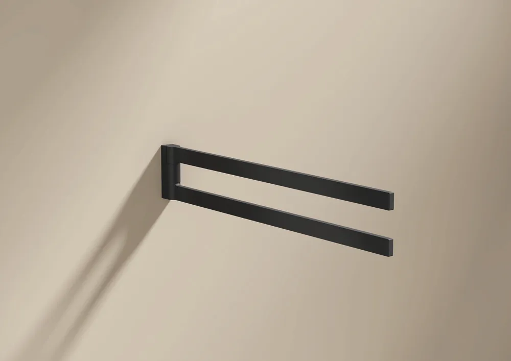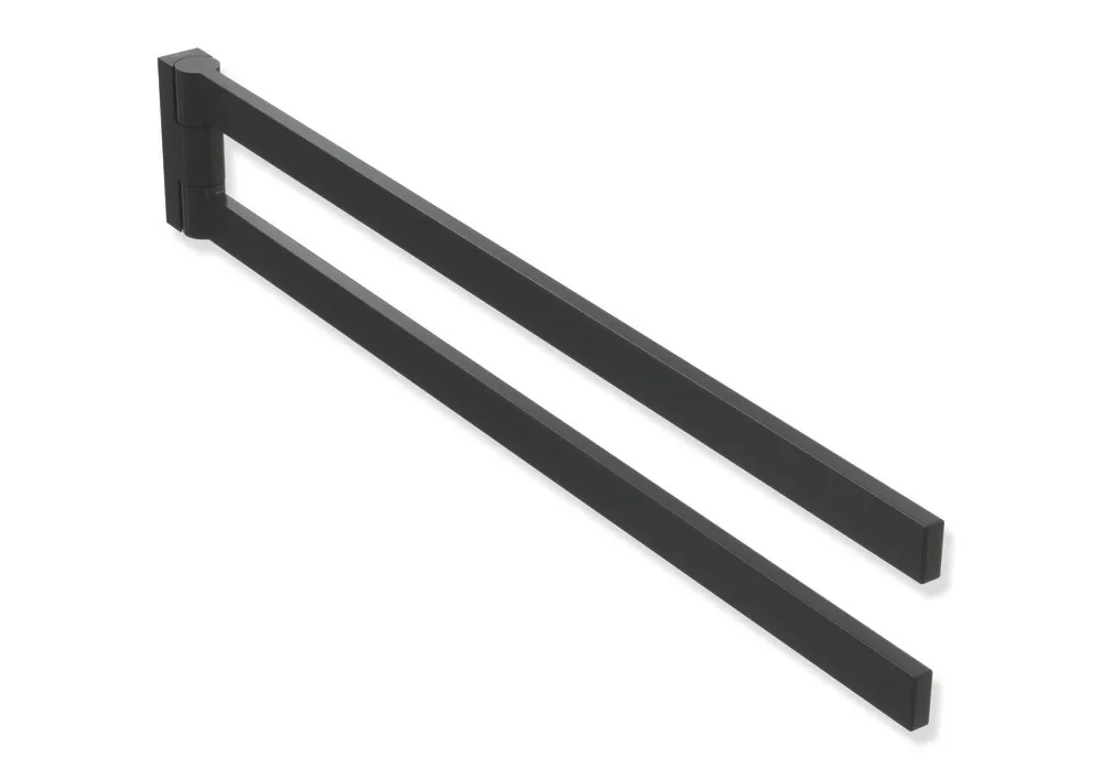 - Handtuchhalter mit zwei übereinander angeordneten Haltearmen im geometrischen Vierkantdesign