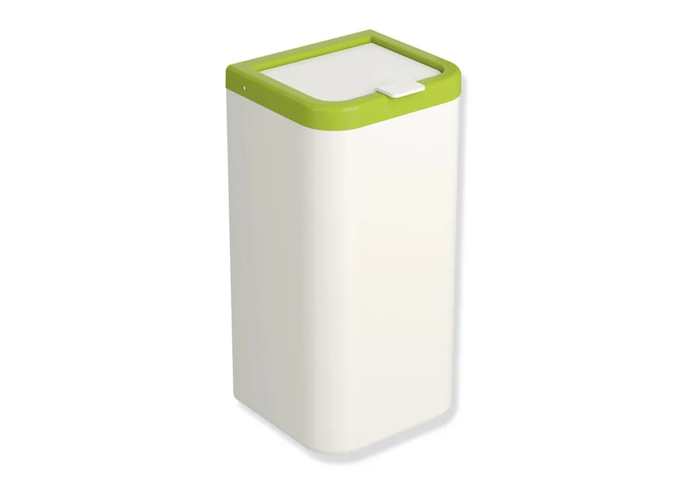 Korpus und Deckel aus hochglänzendem Polyamid in der HEWI Farbe 99 (Reinweiß), Rahmenelement aus hochglänzendem Polyamid, Fassungsvermögen ca. 6 l, Breite 161 mm, Höhe 310 mm, Tiefe 141 mm, Wandmontage.