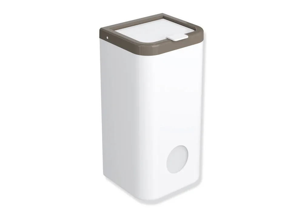 Korpus und Deckel aus hochglänzendem Polyamid in der HEWI Farbe 98 (Signalweiß), Rahmenelement aus hochglänzendem Polyamid, Fassungsvermögen ca. 6 l, Breite 161 mm, Höhe 310 mm, Tiefe 141 mm, Wandmontage.