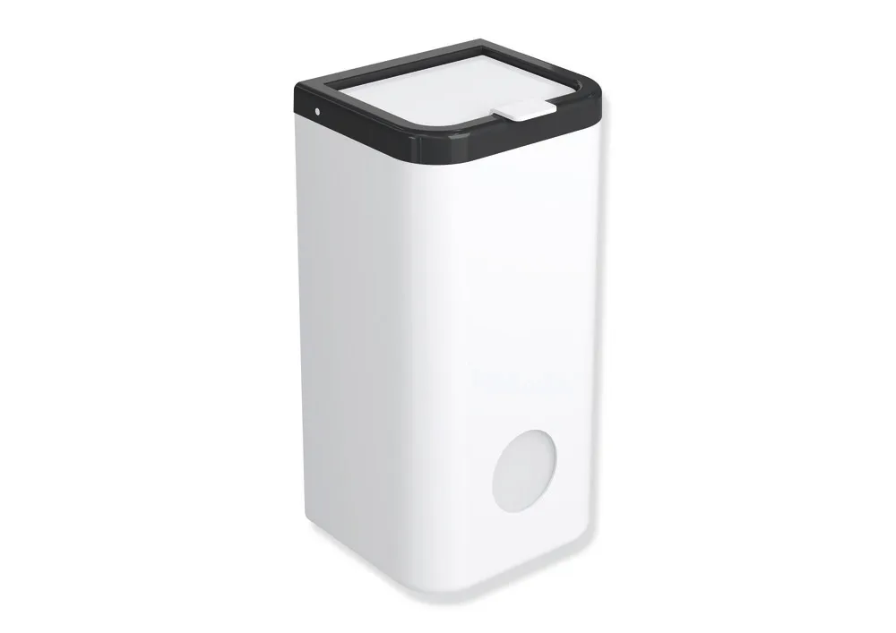 Korpus und Deckel aus hochglänzendem Polyamid in der HEWI Farbe 98 (Signalweiß), Rahmenelement aus hochglänzendem Polyamid, Fassungsvermögen ca. 6 l, Breite 161 mm, Höhe 310 mm, Tiefe 141 mm, Wandmontage.