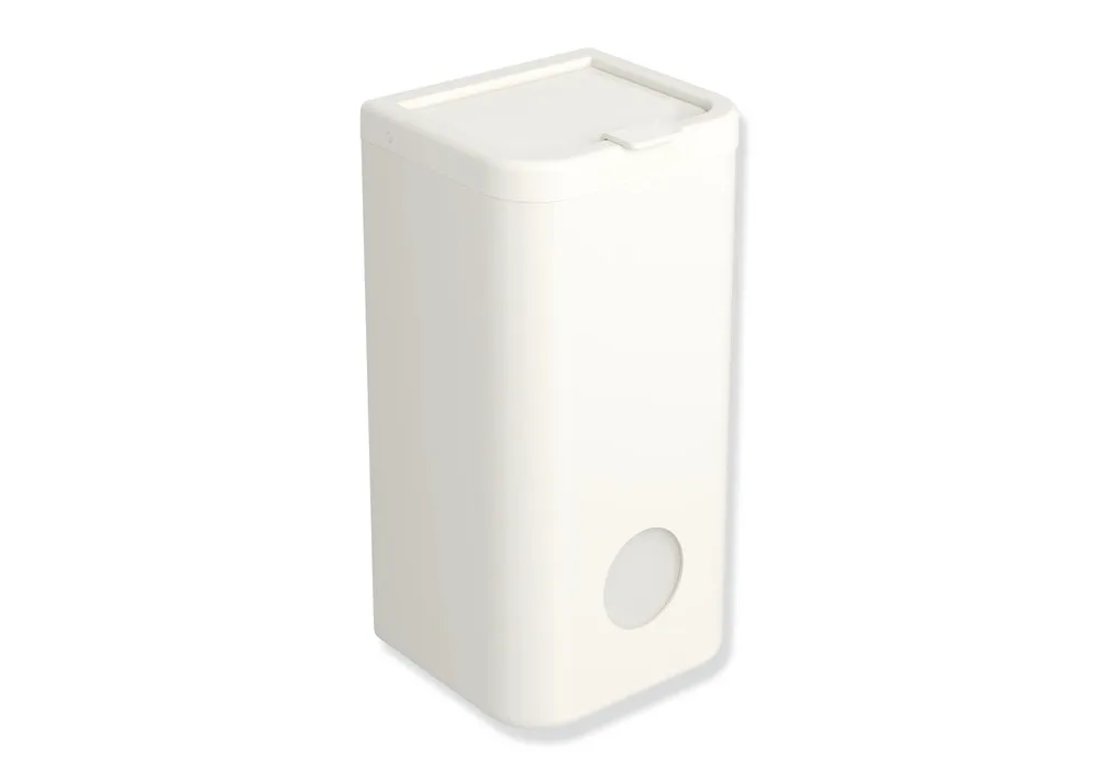 Korpus und Deckel aus hochglänzendem Polyamid in der HEWI Farbe 99 (Reinweiß), Rahmenelement aus hochwertigem, mattem Polyamid, Fassungsvermögen ca. 6 l, Breite 161 mm, Höhe 310 mm, Tiefe 141 mm, Wandmontage.