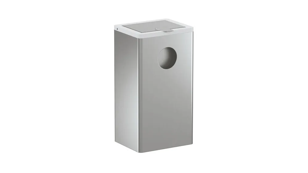 Mehr anzeigen kubischer Grundkörper aus hochwertigem Edelstahl mit eingerücktem Wandsockel. Fassungsvermögen ca. 6 l, unsichtbare, mit integrierter Aufnahme für handelsübliche Hygienebeutel aus Kunststoff (max. Packungsgröße L 130 x B 90 x H 20 mm), 160 mm breit, 300 mm hoch und 140 mm tief, Behälter und Deckel aus hochwertigem Edelstahl, Oberfläche matt geschliffen, Einwurföffnung aus hochwertigem Polyamid in den HEWI Farben 90 (Tiefschwarz), 92 (Anthrazitgrau), 98 (Signalweiß) oder 99 (Reinweiß), inklusive korrosionsfreiem Befestigungsmaterial.