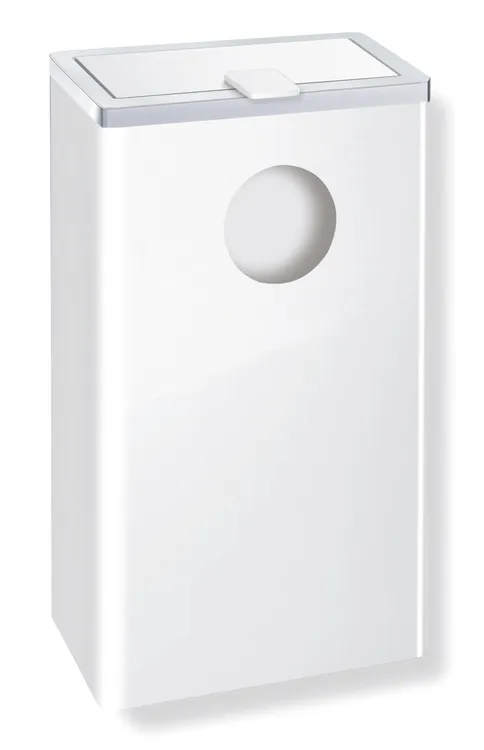 Mehr anzeigen kubischer Grundkörper mit eingerücktem Wandsockel, mit integrierter Aufnahme für Hygienebeutelbox, Fassungsvermögen ca. 6 l, mit integrierter Aufnahme für handelsübliche Hygienebeutel aus Kunststoff (max. Packungsgröße L 130 x B 90 x H 20 mm), Deckel mit Hebelasche, 160 mm breit, 300 mm hoch und 140 mm tief, Behälter und Deckel aus hochwertigem Edelstahl, weiß beschichtet, Einwurföffnung aus hochwertigem Kunststoff, verchromt, inklusive korrosionsfreiem Befestigungsmaterial.