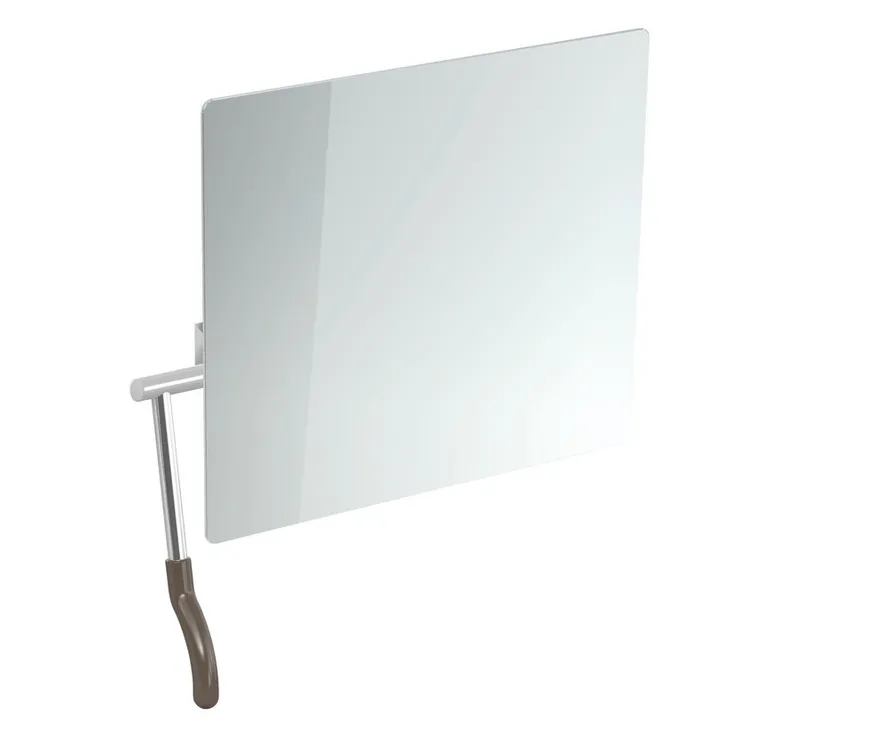 rechteckiger Kristallspiegel mit geschliffenen Kanten und eingearbeitetem Splitterschutz, Hebel links, 725 mm breit, 741 mm hoch, Spiegeltiefe 69 mm, lichtes Maß Wandabstand-Griff 139 mm, Griffstange aus hochglänzend verchromtem Messing, Achse aus Aluminium geschliffen und eloxiert in Farbton E6 EV1, mit ergonomisch geformtem Griff aus Polyamid nach HEWI Farbtabelle, inklusive korrosionsfreiem Befestigungsmaterial.